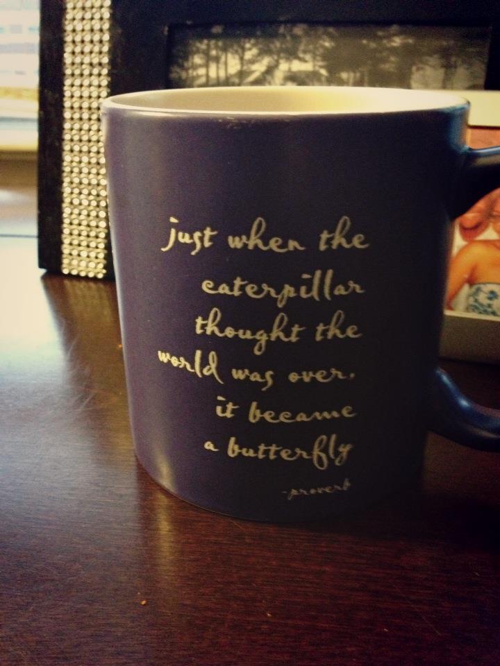 As I was sipping the coffee a few minutes later, I noticed I had grabbed that mug. I laughed. Oh the irony of drinking from a mug with the caption, “Just when the caterpillar thought the world was over, it became a butterfly”. Thought the world was over
