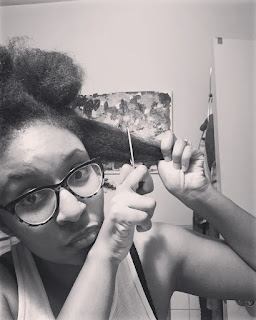 On Wednesday evening, I walked into the bathroom, slid open the medicine cabinet, pulled out a small pair of scissors and paused for about five seconds. I took a deep breathe and cut a large hunk of my hair off on the left side. In less than ten minutes, the sink was full of fro. I was done.